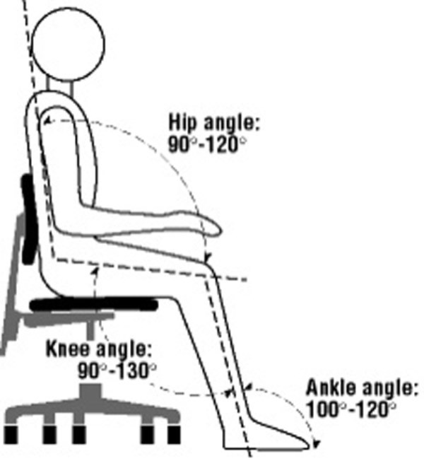 Dựa trên những nghiên cứu về chụp cộng hưởng từ cột sống thắt lưng, nhóm nghiên cứu của ĐH Alberta, Canada khuyến cáo, tư thế ngồi lý tưởng là góc tạo bởi phần thân trên và mặt phẳng ngang là 135 độ, tuy nhiên đó là tư thế lý tưởng khi ngồi nghỉ ngơi vì nó ít tạo áp lực lên đĩa đệm cột sống nhất. Còn để làm việc một cách thuận tiện thì nên bố trí ghế ngồi có tựa lưng để tạo thành một góc khoảng từ 100-110 độ giữa mặt phẳng lưng và mặt phẳng ngang của ghế.